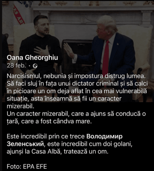A médialincselésnek kitett személy, Oana Gheorghiu azért került célkeresztbe, mert Ilie Bolojan kormányfő aznap azt javasolta Nicuşor Dan államelnöknek, hogy a korrupciós vádakkal illetett és lemondatott Dragoş Anastasiu helyére őt nevezze ki miniszterelnök-helyettesnek. A tegnapi adás házi „megmondó emberei” azt rótták fel a kormányfő-helyettesnek javasolt hölgy megbocsáthatatlan „bűnéül”, hogy miután idén februárban, emlékezetes első találkozásuk alkalmával Donald Trump frissen megválasztott amerikai elnök egészen más hangnemben tárgyalt Volodimir Zelenszkijjel, mint amilyenhez elődje, Joe Biden szoktatta az ukrán elnököt (meg a világot), Oana Gheorghiu a következő Facebook-bejegyzést tette. „A nárcizmus, az őrület és a képmutatás pusztítják a világot. Egy gyilkos diktátor előtt hajbókolni, miközben egy már amúgy is kiszolgáltatott embert eltaposol, azt jelenti, hogy nyomorult jellem vagy. Egy valaha nagy ország élére került nyomorult jellem. Hihetetlen, min megy keresztül Volodimir Zelenszkij, hihetetlen ahogyan a Fehér Házba jutott két semmirekellő (románul: golan) bánik egy emberrel”.